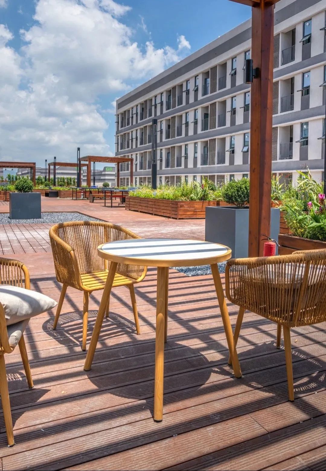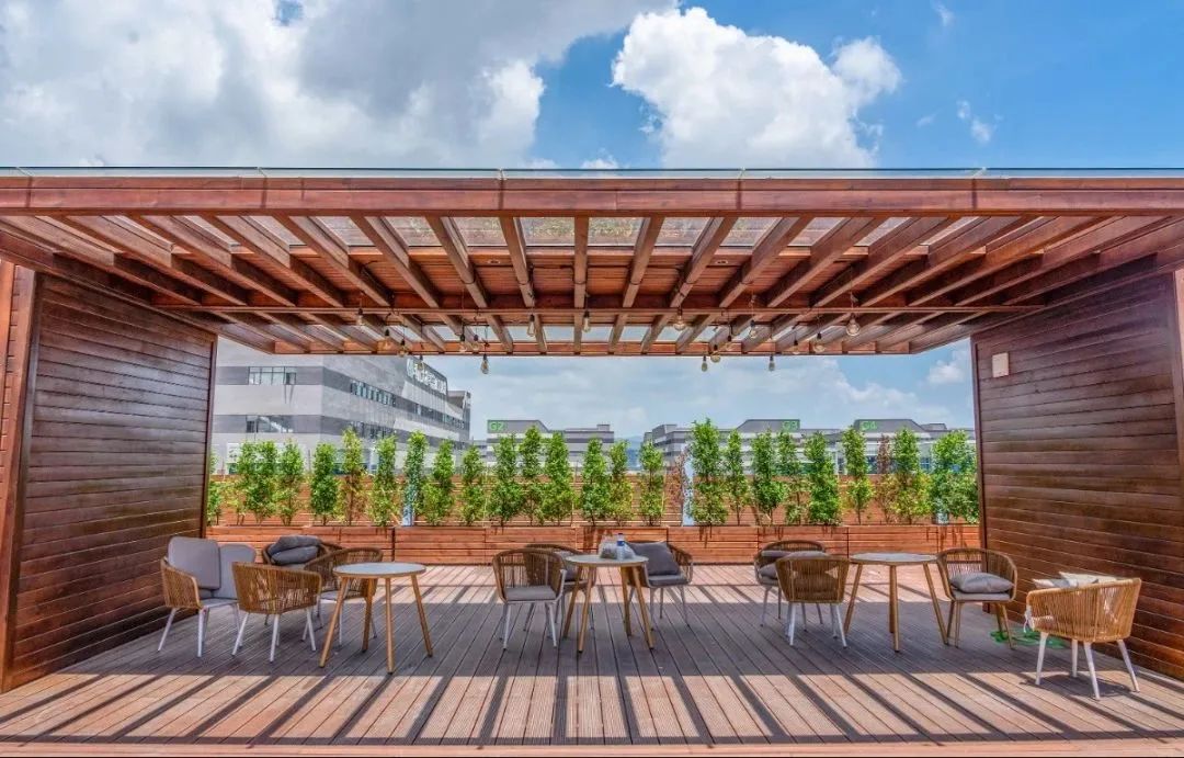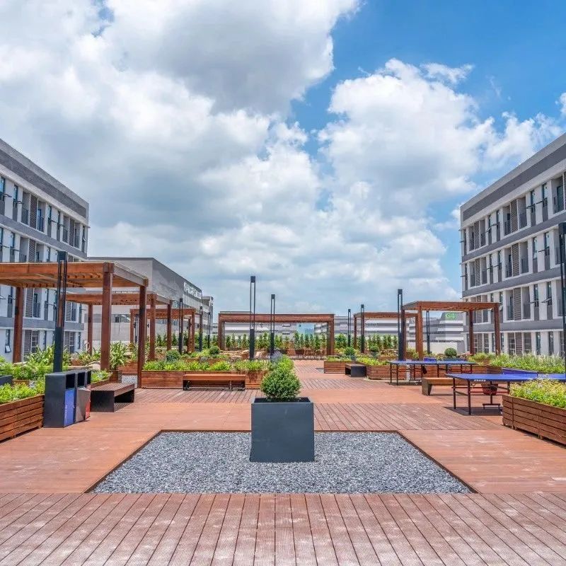 公共服務(wù)中心三層平臺(tái)設(shè)置了屋頂花園,形成半開放式創(chuàng)新社區(qū)??紤]到公共服務(wù)中心宿舍的分布,屋頂花園位于兩側(cè)宿舍動(dòng)線中軸。