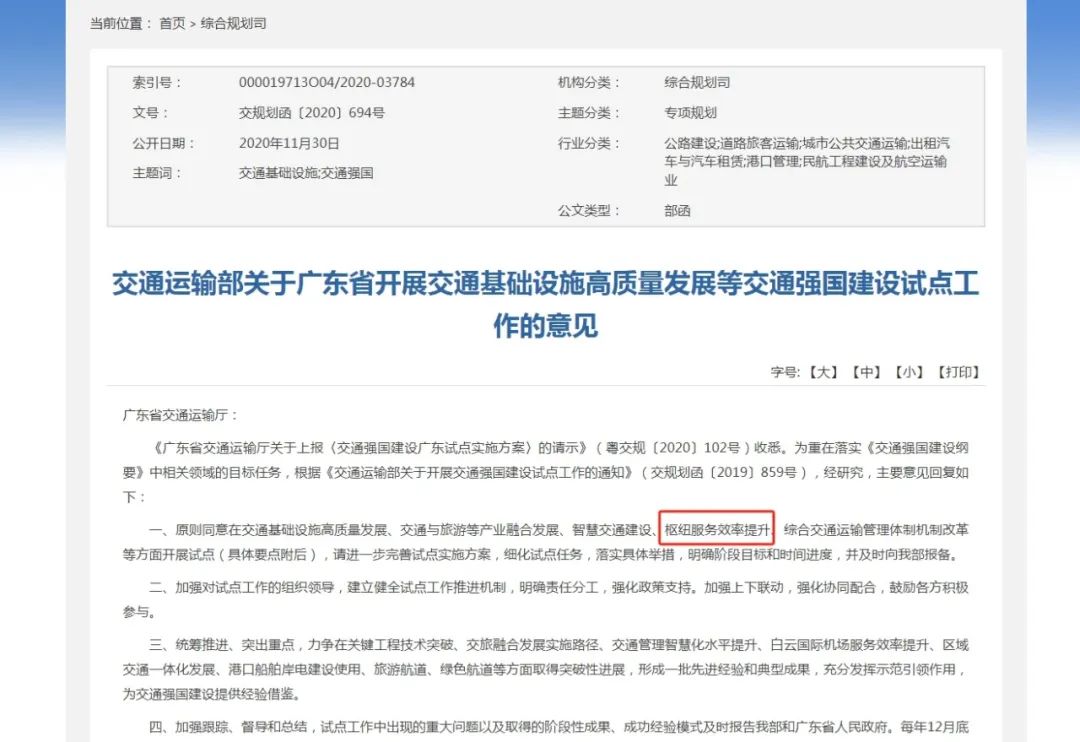 2020年10月10日,交通運(yùn)輸部將“樞紐服務(wù)效率提升”列為廣東省承擔(dān)的全國交通強(qiáng)國建設(shè)試點(diǎn)任務(wù)之一,包括提升口岸通關(guān)便利化水平、提升白云機(jī)場(chǎng)國際航空樞紐輻射能力、提升港口智慧綠色發(fā)展水平三塊板塊。