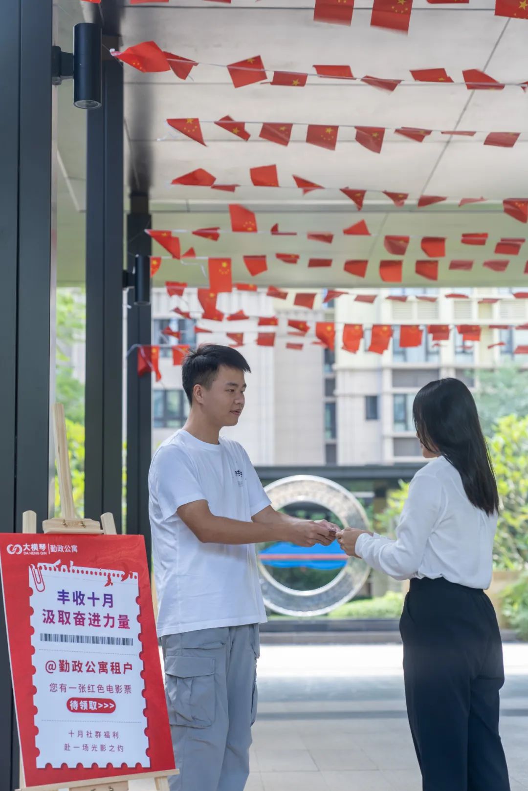 此外,大橫琴泛旅游公司也在旗下運營的多個公寓項目推出國慶特色主題活動,陪伴假期留駐的住戶們度過一個喜慶、歡樂的國慶佳節(jié)。國慶黃金周期間,勤政公寓開展了“豐收十月 汲取奮進力量”活動,通過播放免費電影豐富住戶生活,傳播奮進力量;斗門大橫琴5.0產(chǎn)業(yè)新空間倒班宿舍也開展了 “青年共話中國紅”國慶主題抽獎活動,設(shè)置留言祝福墻,以青春之言,表白祖國。