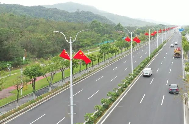 鮮艷的五星紅旗迎風(fēng)招展,與藍(lán)天白云相映成輝,為道路注入莊嚴(yán)喜慶、歡樂祥和的節(jié)慶氣息。