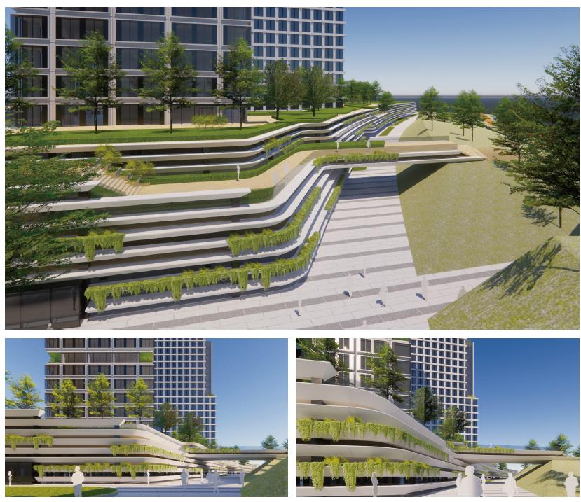 建筑組團(tuán)中央,通高兩層的“城市客廳”成為思想碰撞的熔爐;三層空中云臺通過有蓋廊道串聯(lián)樓宇,形成全天候的公共步行紐帶;而垂直分布的空中花園與地面綠脊,共同構(gòu)建出覆蓋率超30%的生態(tài)綠脈。