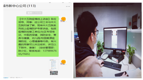 為進一步做好疫情防控工作,提升職工疫情防控知識及提高心理調(diào)適能力,城市新中心公司工會與中大五院健康管理科聯(lián)系對接,組織職工收聽中大五院疫情防護系列專家講座。